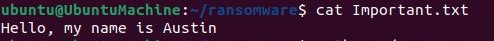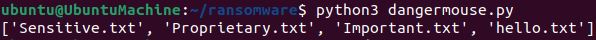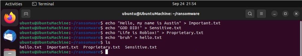 Please make sure that if you plan on trying this lab out that you have a disposable VM on hand since we do not want to accidentally ruin any real files. After running up my Ubuntu VM, the first step I took was to make a couple example files that I want to eventually encrypt with the script, “hello.txt, Important.txt, Proprietary.txt, and Sensitive.txt.”
