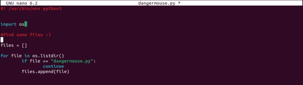 To start the script, I assigned a list called files. To gather all the files, we can assign a for loop that will go through every file within the directory and append it. We also want to make sure that if our script goes through every file that it makes an exception for our malware file titled, “dangermouse.py”.