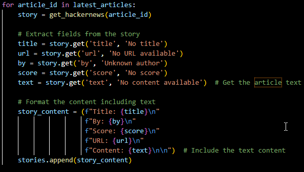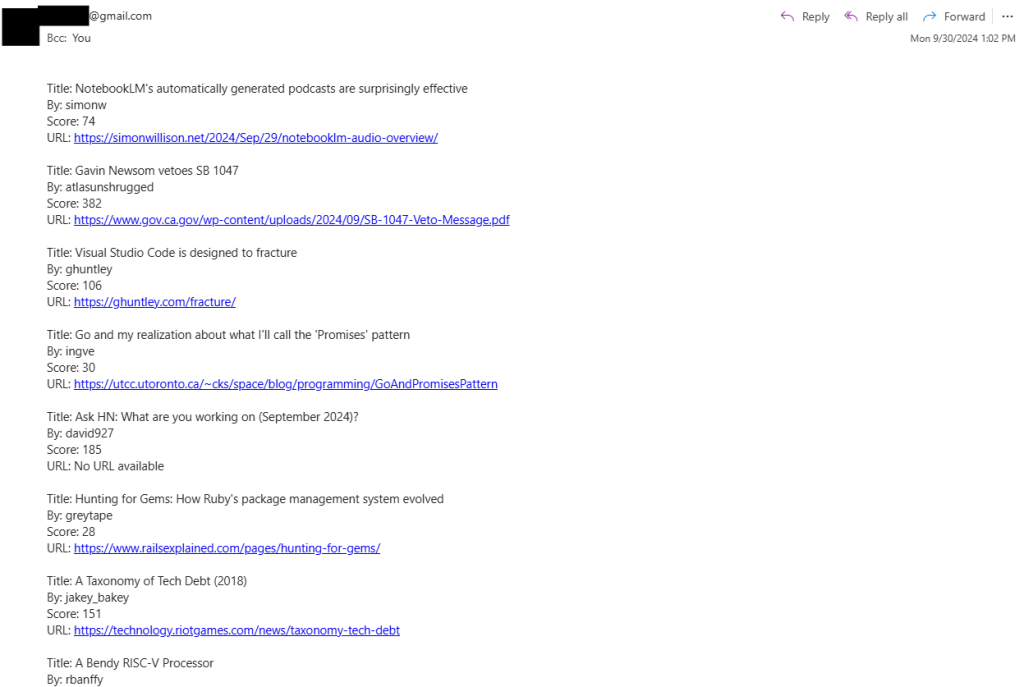 I make sure to pull the top 10 story IDs of the past 24 hours which then populates into my URL template allowing me to get links, titles, authors, and upvote counts for my tailored newsletter.