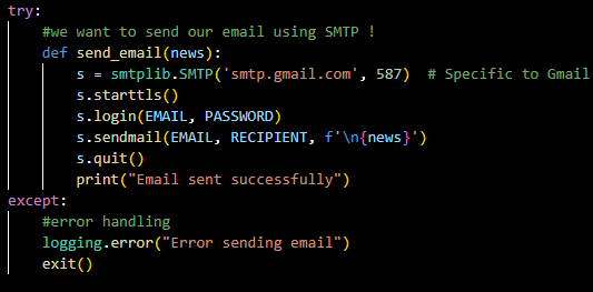 Secondly, I did some research on utilizing code to send an email from a Python file. I had to use the smtplib module to be able to send an email over Simple Mail Transfer Protocol (SMTP). All the specifications as what to specify are in the documentation in which I had to use the specific value of 587 to send a Gmail value.